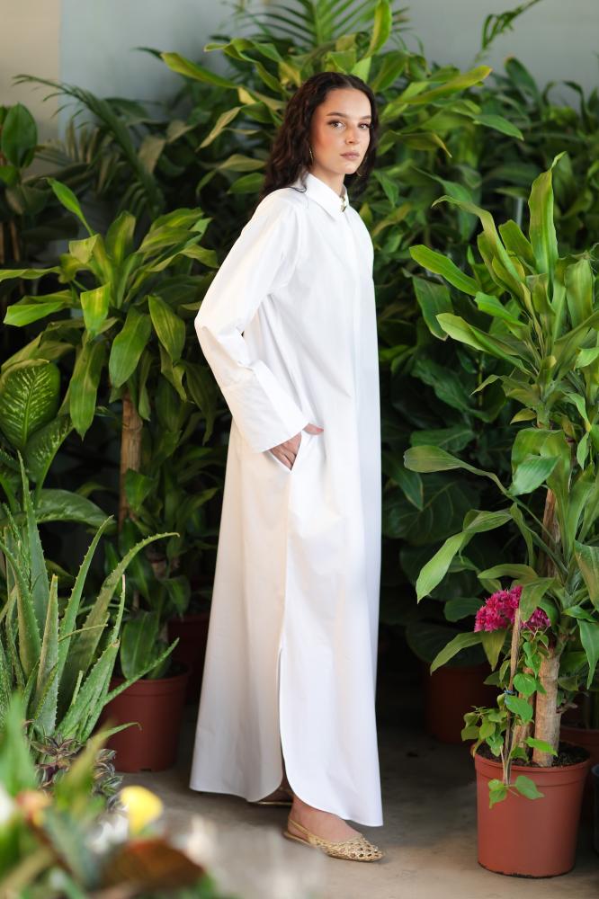 - فستان القميص الأبيض مصنوع من البوب لين الفاخر.