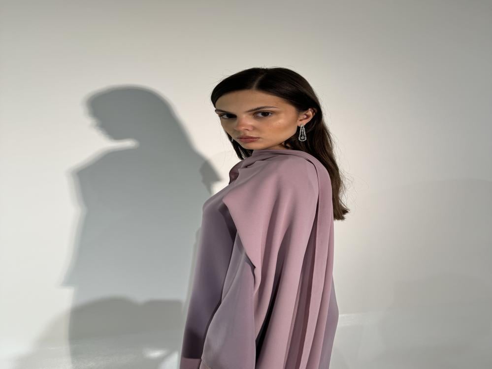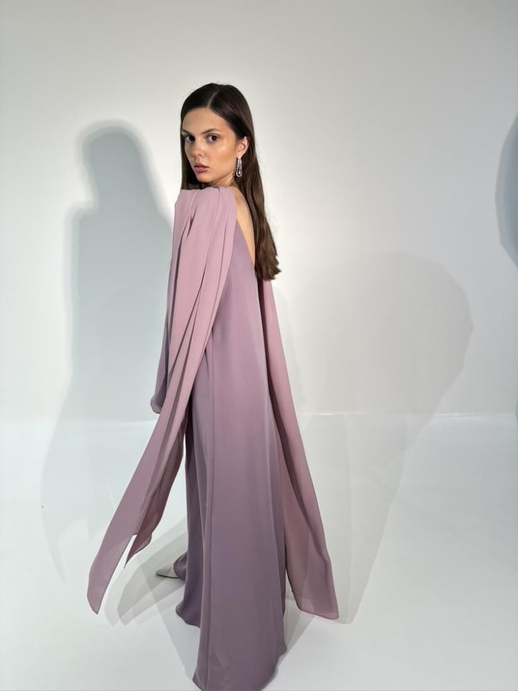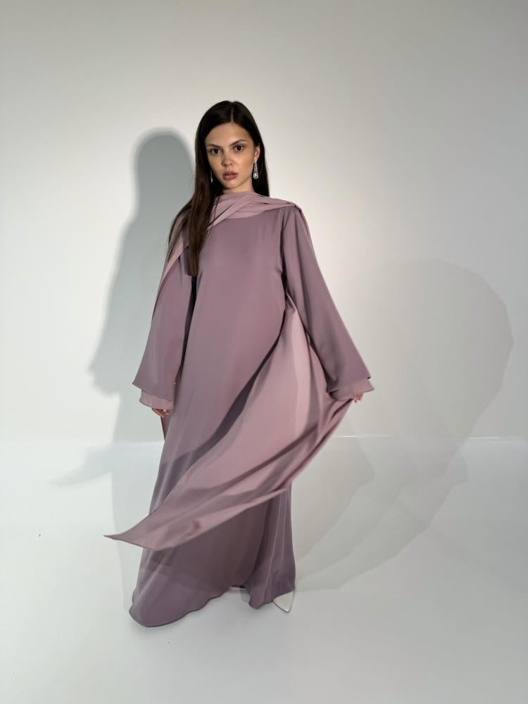 - ثوب من الكريب الابيض وشال شيفون طويل مثبت عند العنق