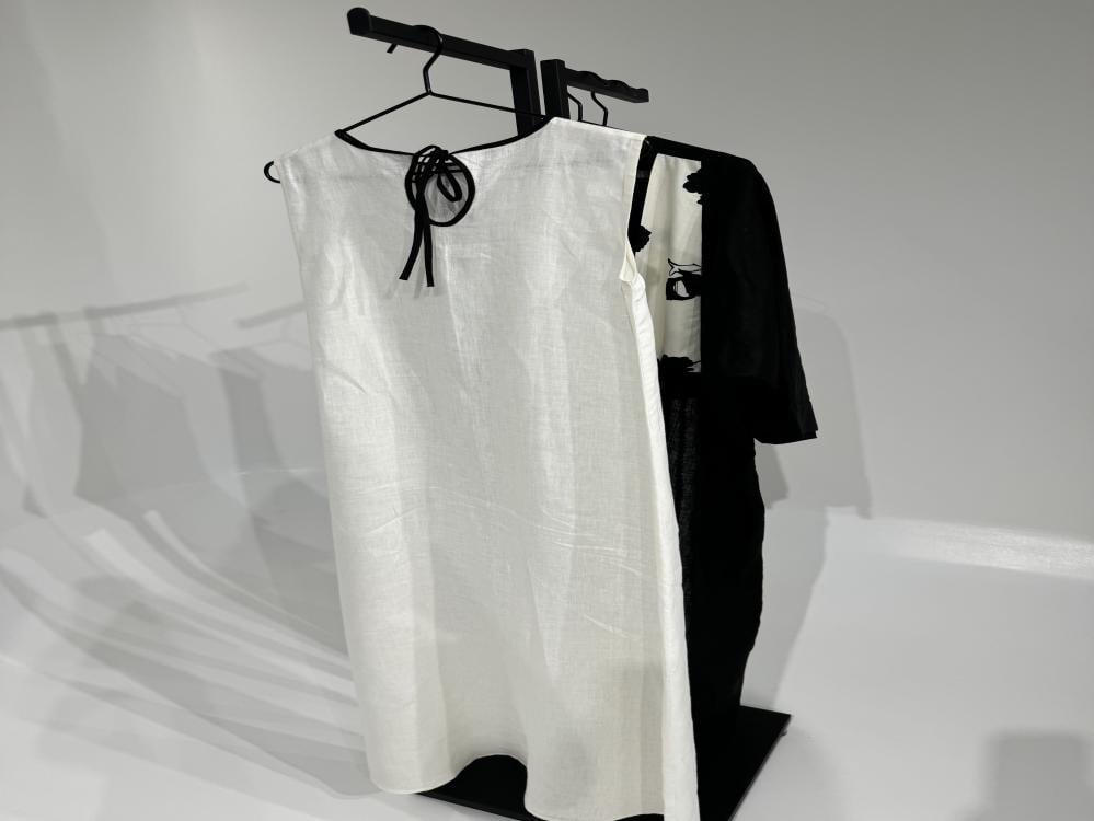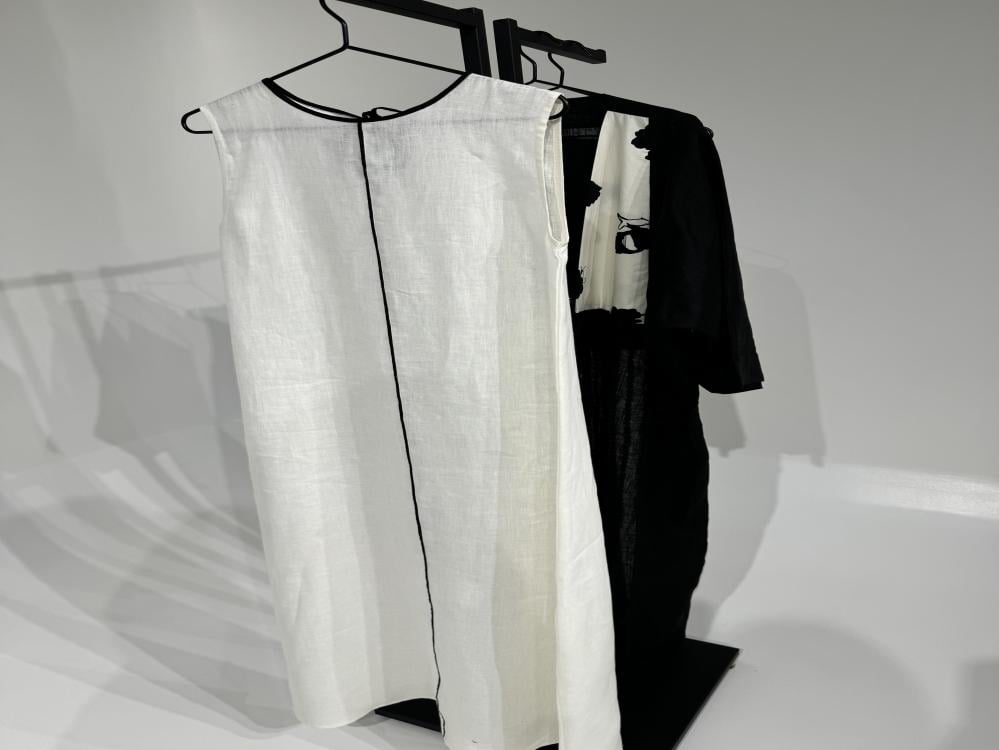 - فستان لينن ابيض بدون اكمام مزين بخط أسود بالمنتصف ورقبة عالية بربطه من الخلف .
