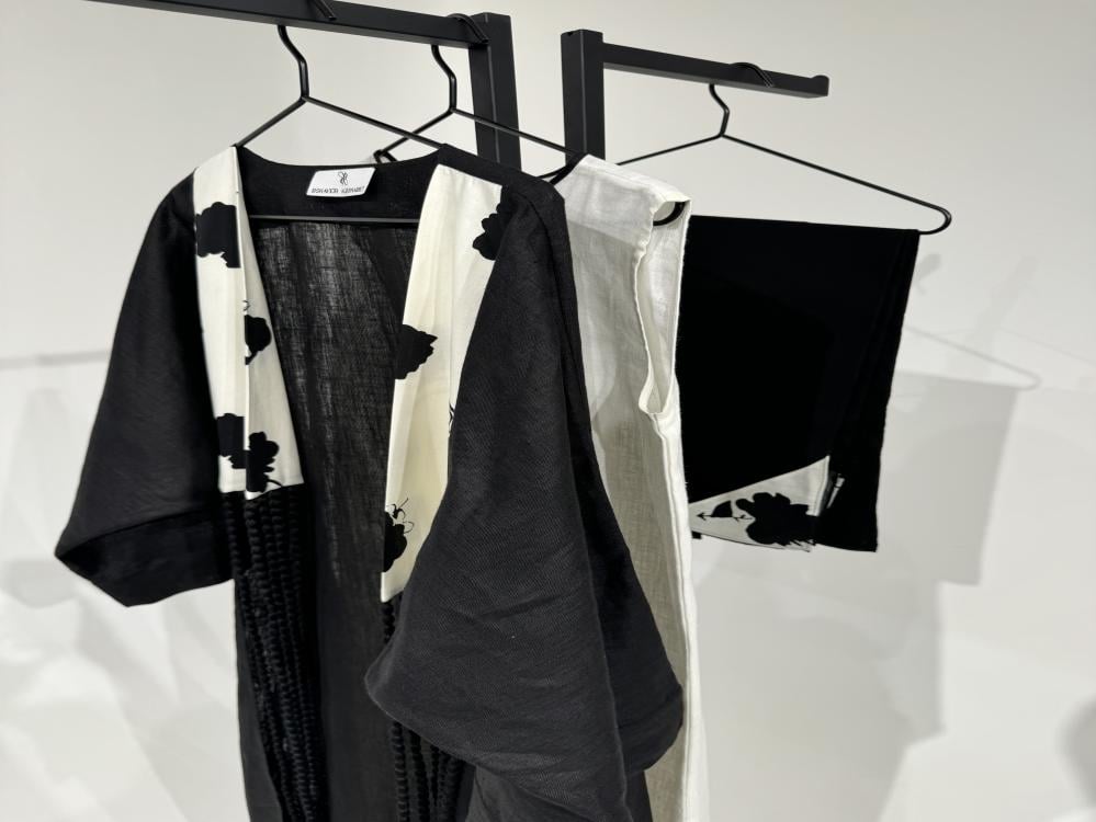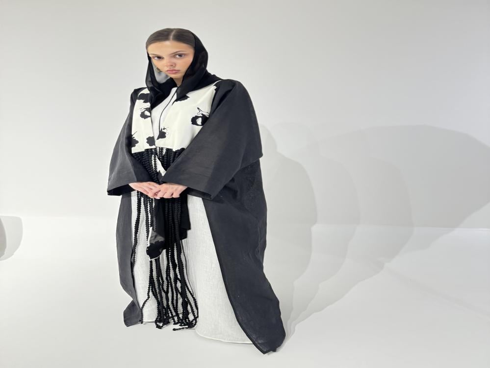 - عباية الكيمونو من اللينن الأسود مفتوحة من الأمام مزينه بحبال سوداء .