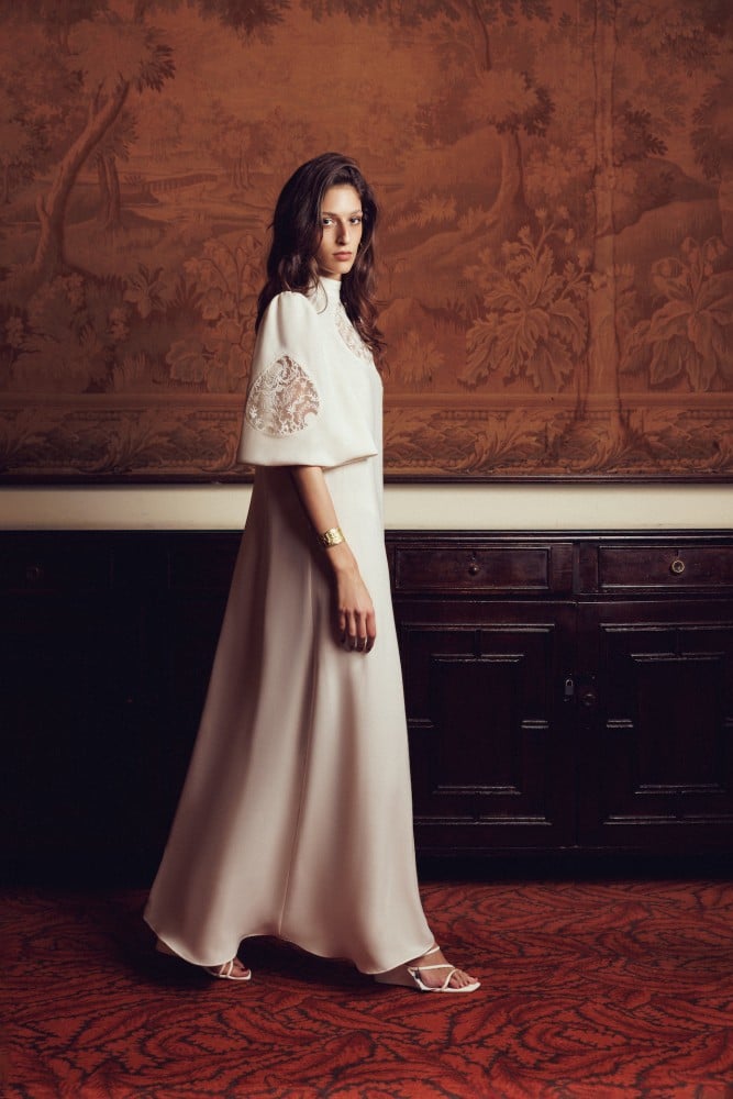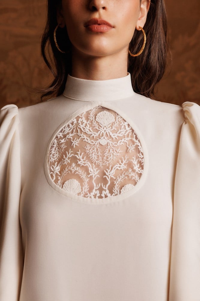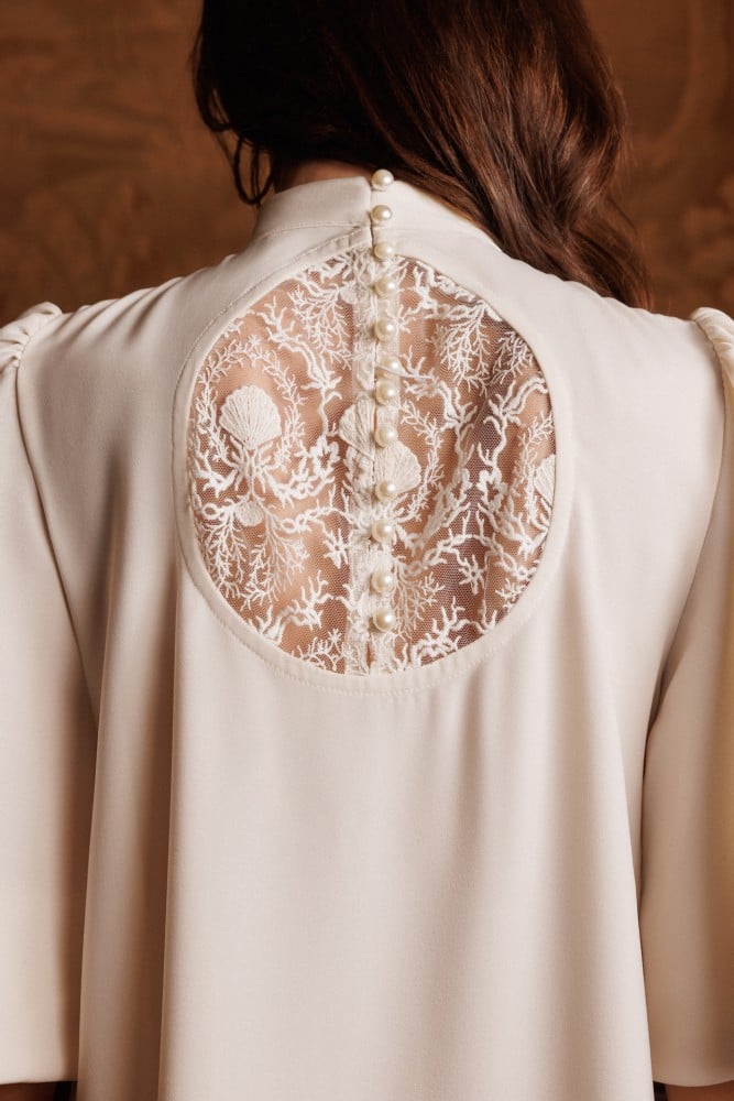 • مصنوع من الكريب الفاخر وجوبير مزخرف بالأصداف على الصدر والاكمام والظهر
