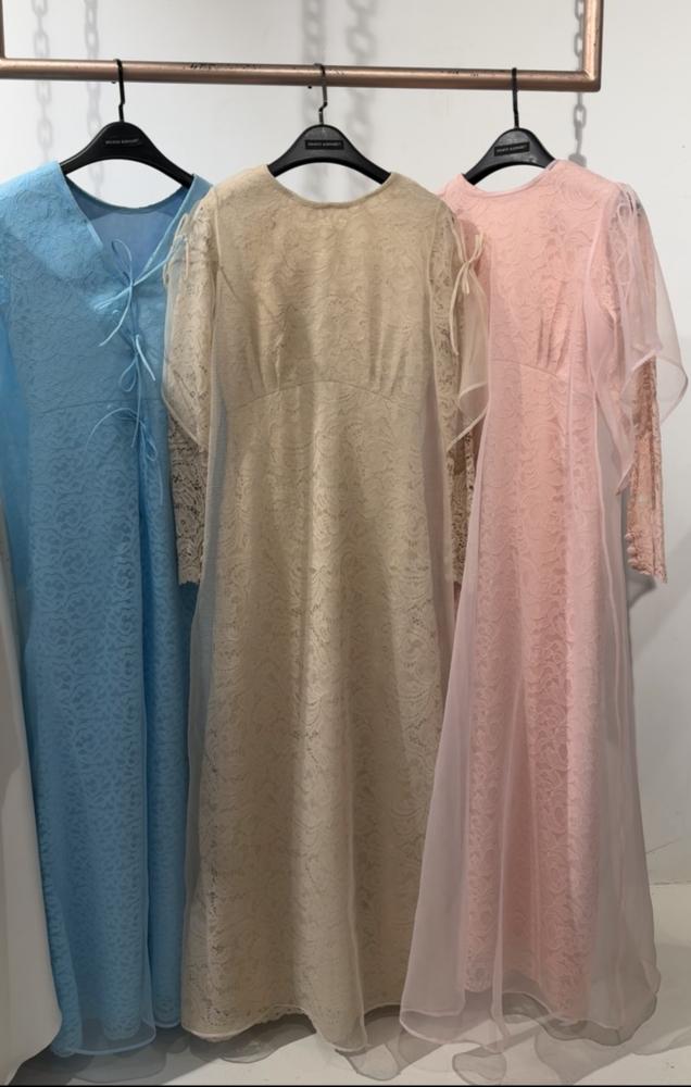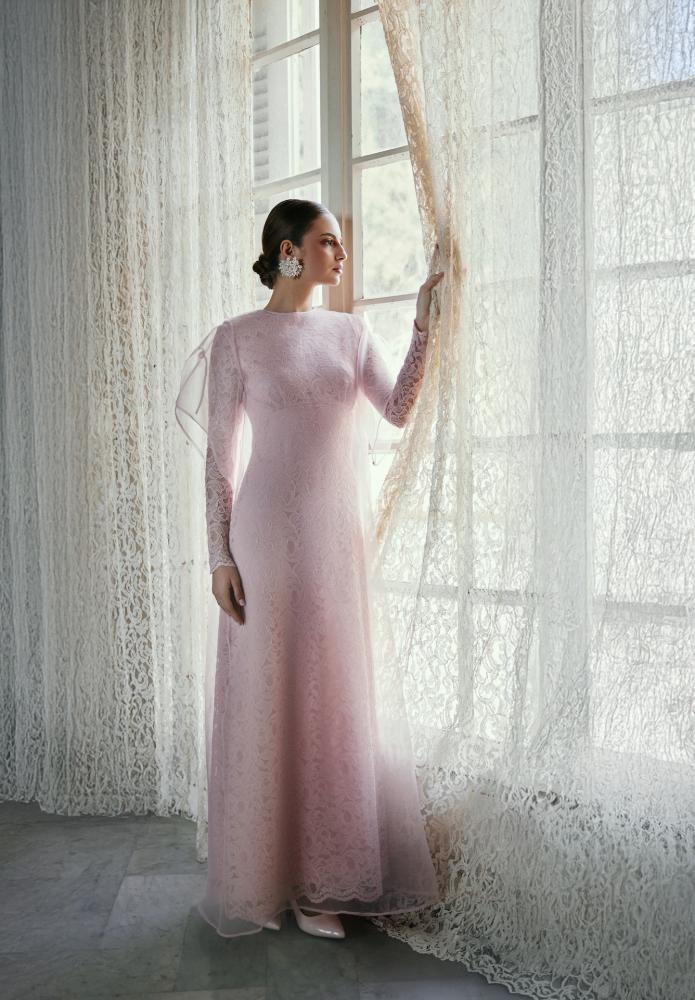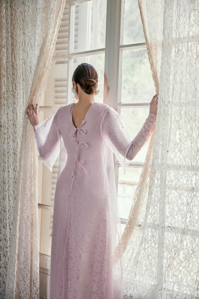- فستان من الجوبير الوردي مزين بالأزارير مبطن بالكريب.