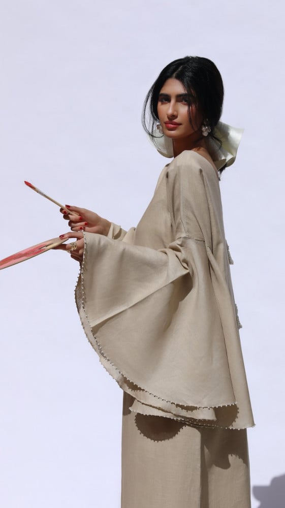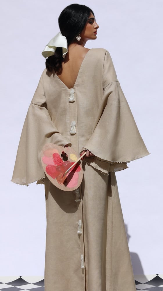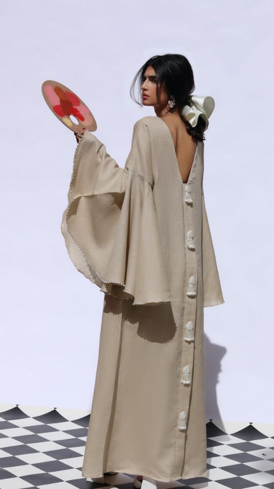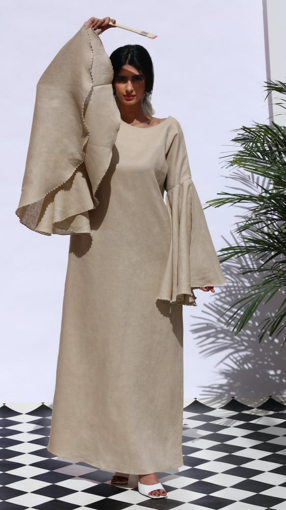 - ثوب من قماش اللينن البيج مزين بالشك من دناديش الؤلؤ