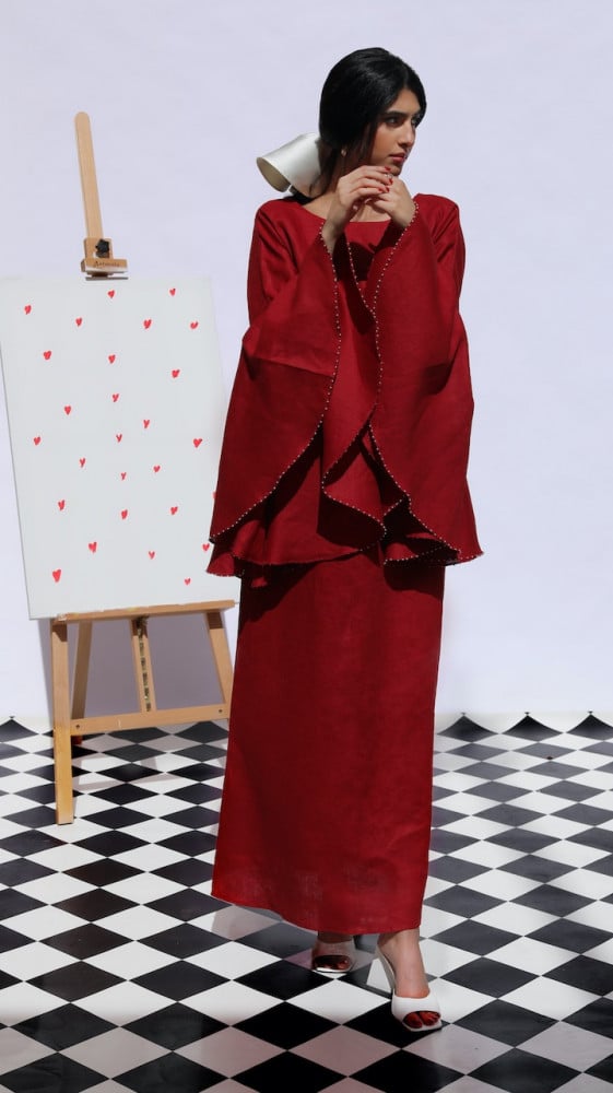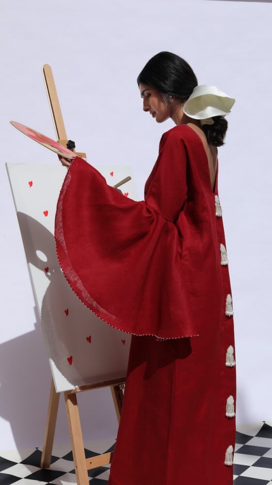 - ثوب من قماش الينن العنابي مزين بالشك من دناديش الؤلؤ