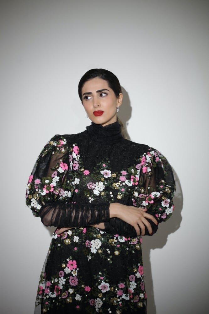 - A tulle dress with sequins in the shape of colorful flowers and crisp tulle sleeves.