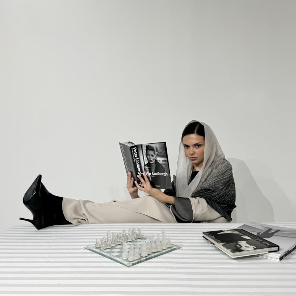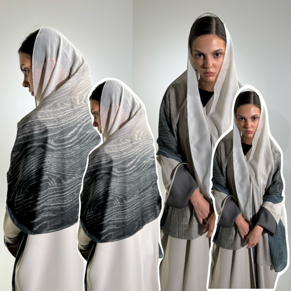 - The veil is laser-printed chiffon on wood in shades of gray and black.