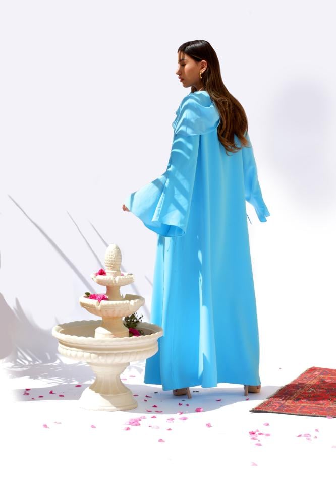 - مزين بالشيفون بقصات مثلثة بالاكمام وربطات للتحكم بشكل الاكمام